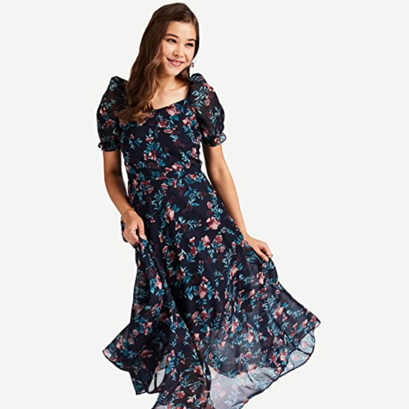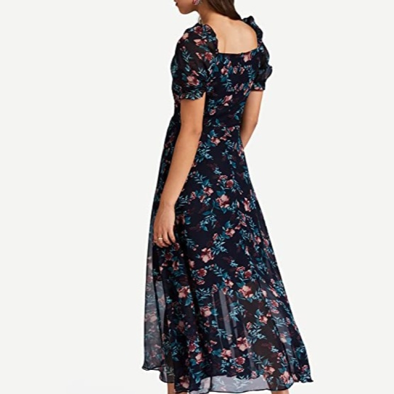 • المرأة عارضة الأزرق الأزهار ماكسي حبيب الرقبة أكمام قصيرة تناسب وتوهج اللباس