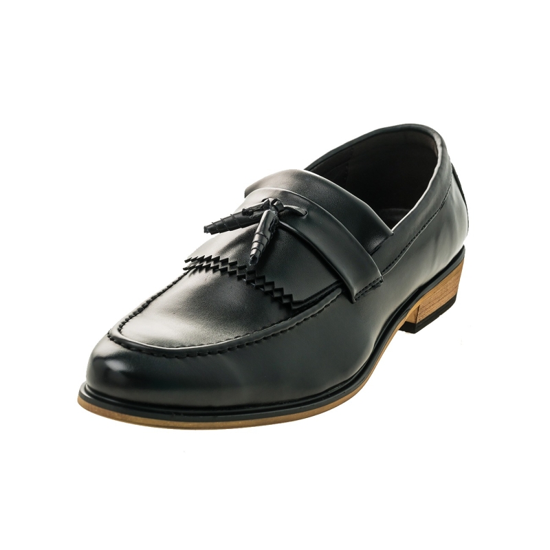 A pair of Black solid pointed toe formal slip-ons has tassel moccasin, has a slip-on closure