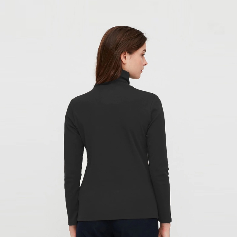 Black solid T-shirt, has a turtle neck, and long sleeves.