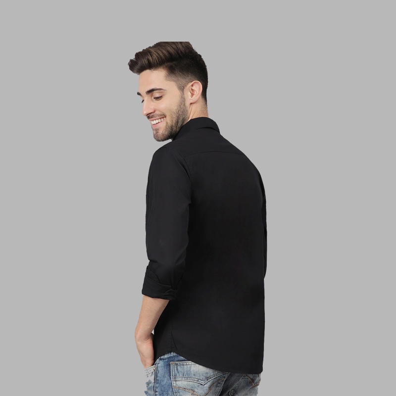 قميص كاجوال أسود صلب، بياقة عريضة، أزرار ضيقة، وحافة منحنية