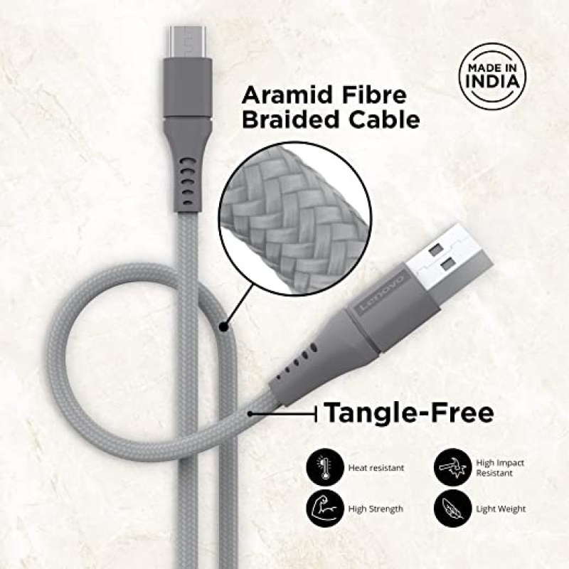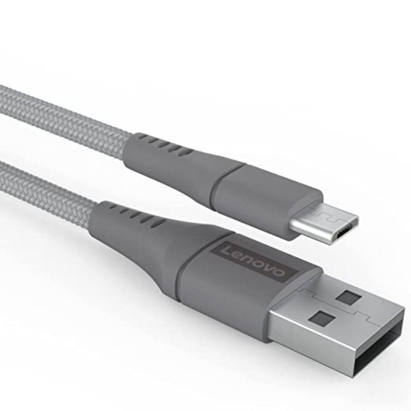 Lenovo Micro USB Tangle-free Aramid fiber braided 1m cable with 4A charging & 480 MBPS data transmission, certified 10000+ bend lifespan, Metallic Grey