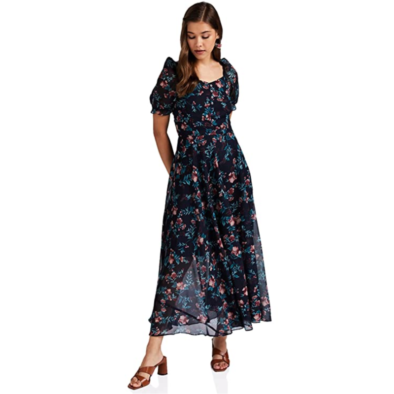 • Women Casual Blue Floral Maxi Sweetheart Neck Short Sleeves Fit and Flare Dress