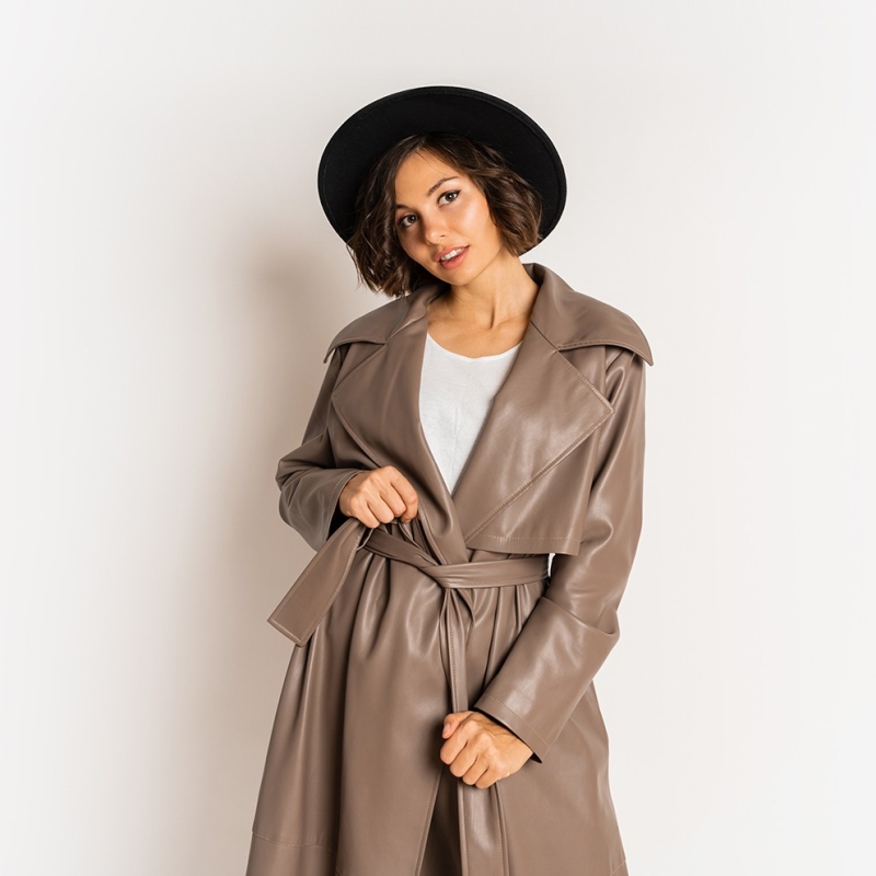 Brown solid faux leather font-open longline trench coat, has notched lapel collar, long sleeves and single vented hem